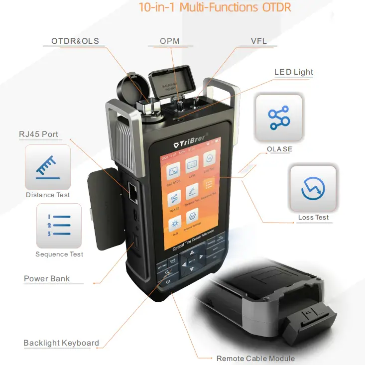 OTDR/OLS/OPM/VFL/LED Light/RJ45 Port (Distance Test, Sequence Test)/OLA SE/Loss Test/Backlight Keyboard/Remote Cable Module